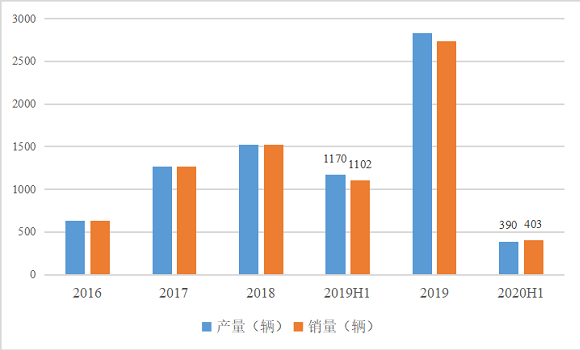 圖1 中國2016-2020H1燃料電池汽車產(chǎn)銷量