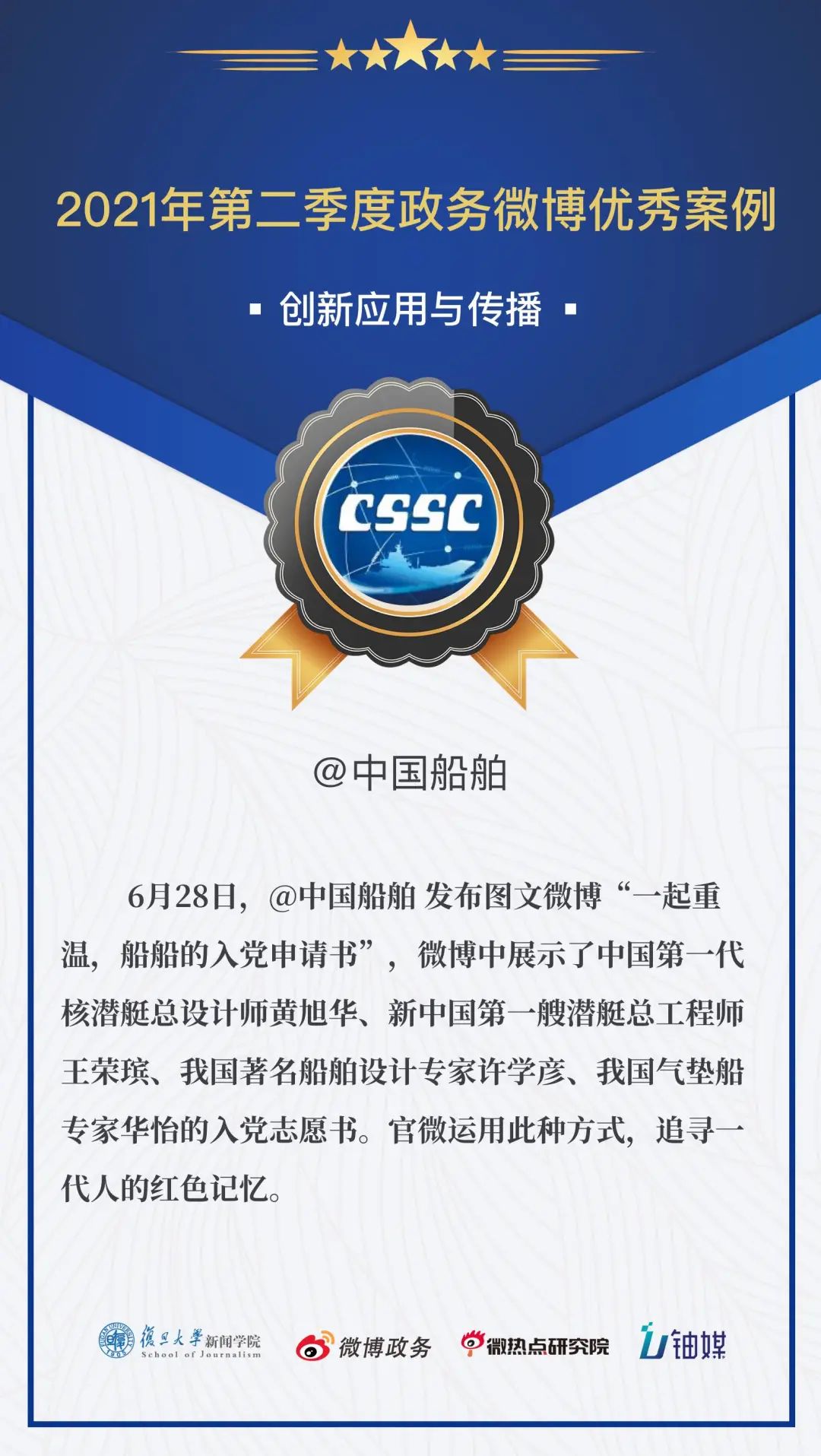 在幾百個微博政務賬號、幾千個微博政務優秀案例的評選中,@中國船舶 憑借圖文微博“一起重溫,船船的入黨申請書”,再一次拿下“創新應用與傳播”的獎勵,真的是太棒了!